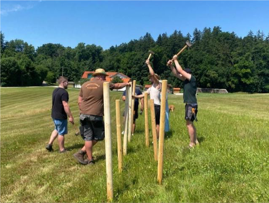 Die Jungbauern schwangen mit Kraft und Begeisterung den Hammer, ein mitgebrachter Ghettoblaster sorgte trotz 34°C für schwungvolle Laune. Das Schnittgut der älteren Streuobstwiese nebenan wurde kurzerhand mit dem Pick-up an Ort und Stelle verfrachtet - dann ging`s ab in den Schatten zu eisgekühlten Getränken und weniger spannender Theorie.