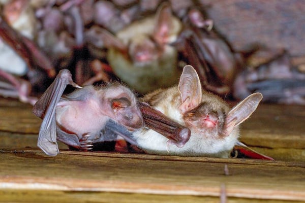 v.l.: 1) Zwergfledermaus; 2) Zwergfledermaus; 3) Großes Mausohr säugt Junges;